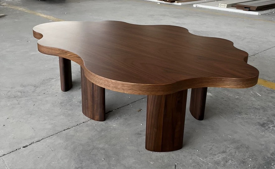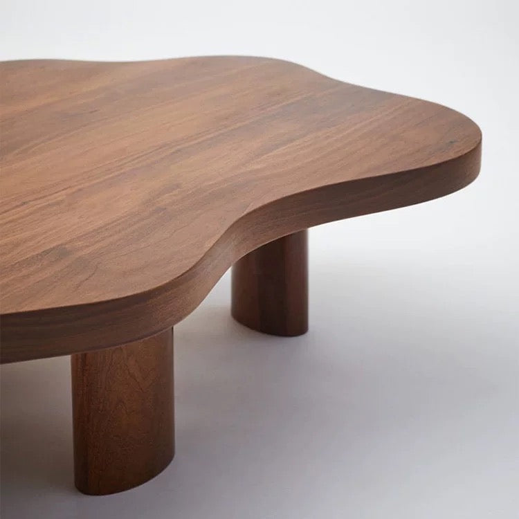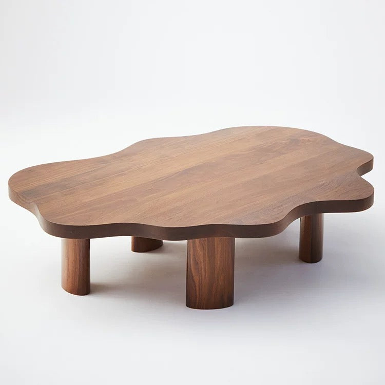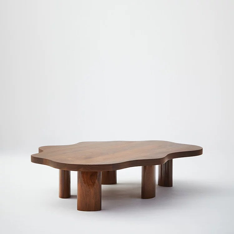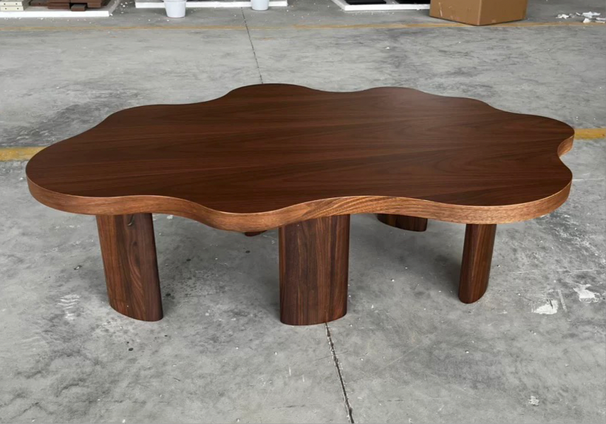 Expertly crafted, the Kari coffee table boasts an irregular shape and is made from solid wood, finished with a sleek walnut wood veneer. This unique design adds a touch of modern elegance to any living space, while the sturdy construction ensures long-lasting durability. Upgrade your decor with this one-of-a-kind piece.