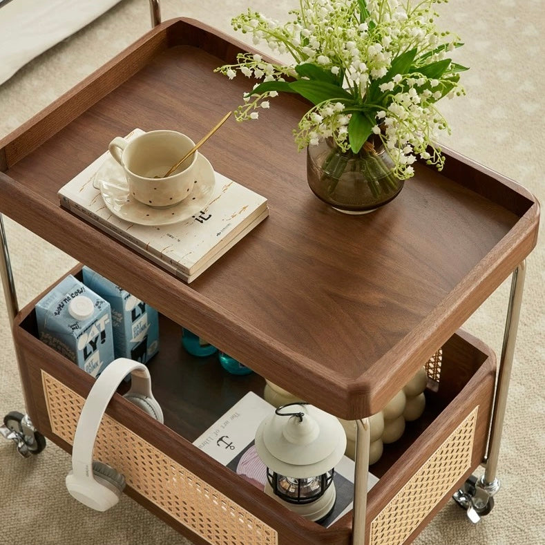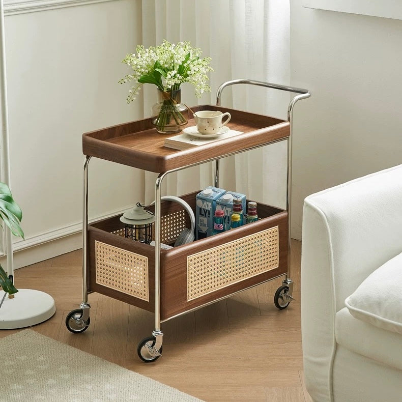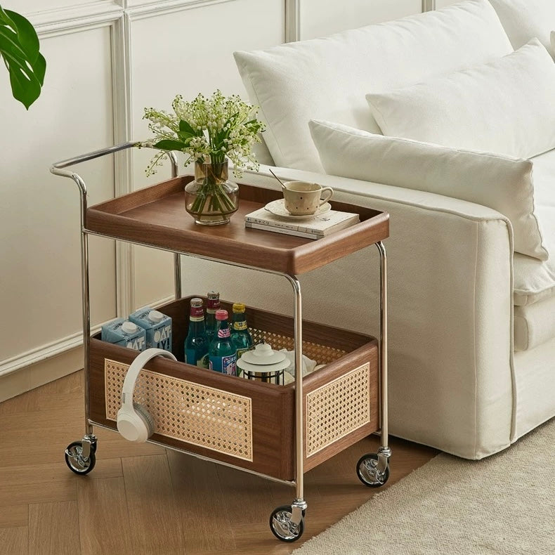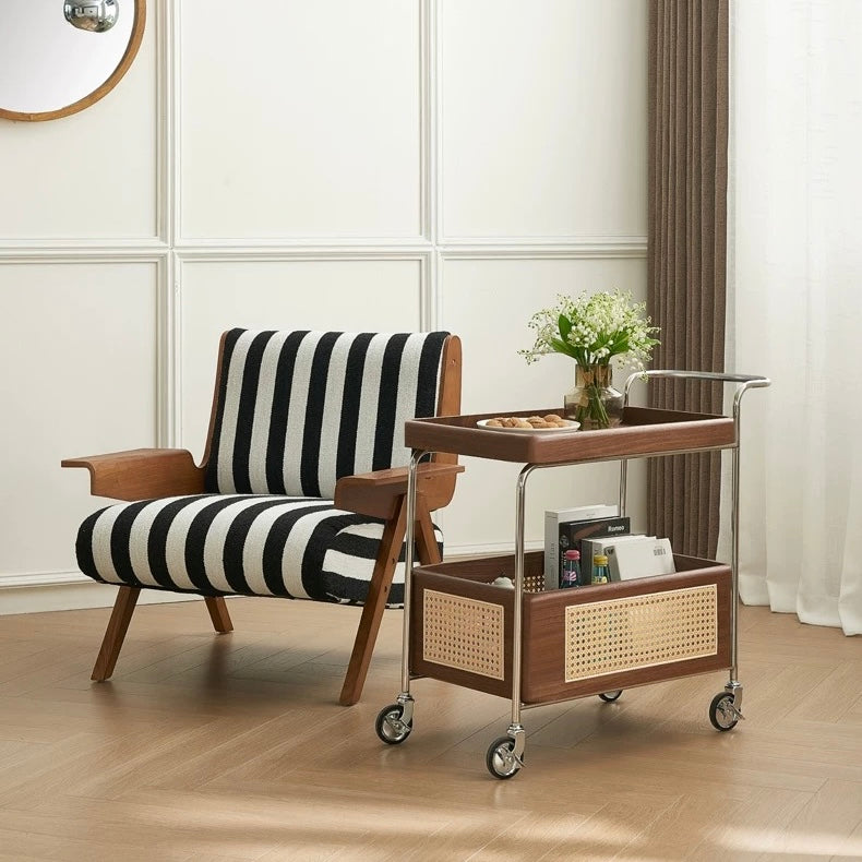 Elevate your entertaining space with the Kent bar cart, a sophisticated blend of form and function. Featuring elegant rattan detailing and premium walnut wood veneer, this cart offers a refined aesthetic while providing practical mobility for serving drinks. The natural materials create a warm, inviting presence that complements both contemporary and traditional interiors.