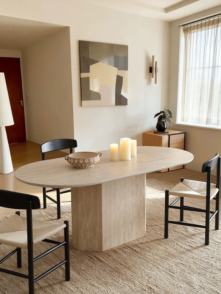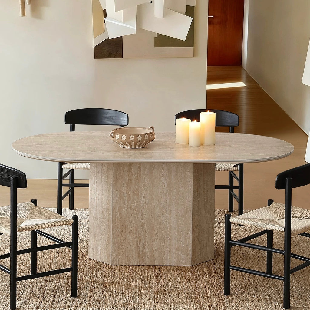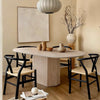 Introducing our Tate dining table, featuring a durable sintered stone top with the elegant look of travertine. Made to last, this table adds a touch of sophistication to any dining room. Experience the beauty of natural stone without the maintenance.